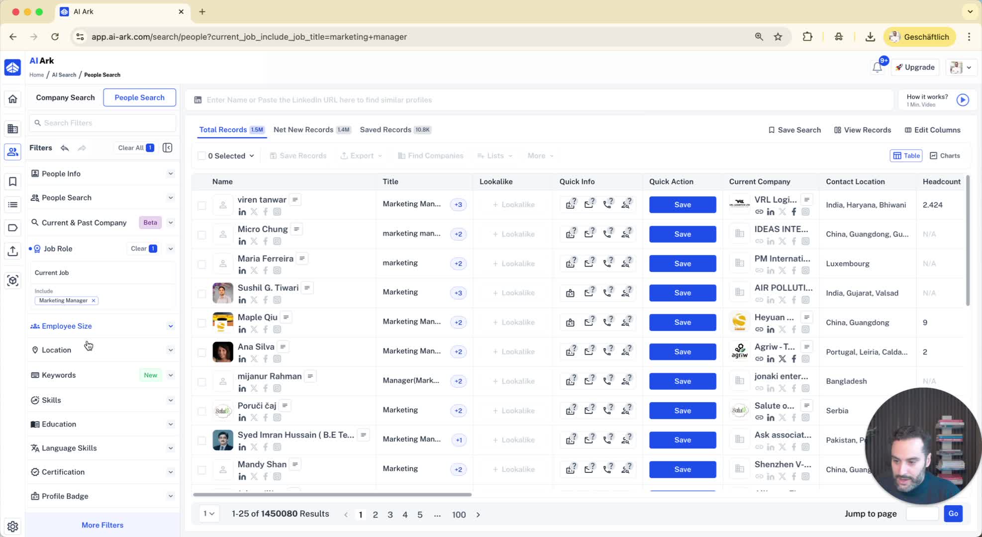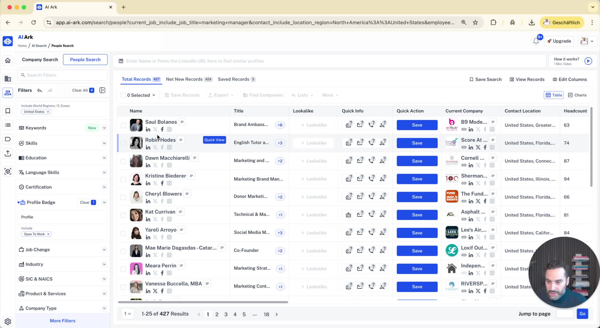 Example: Search for 'Marketing Managers' in the 'United States'.