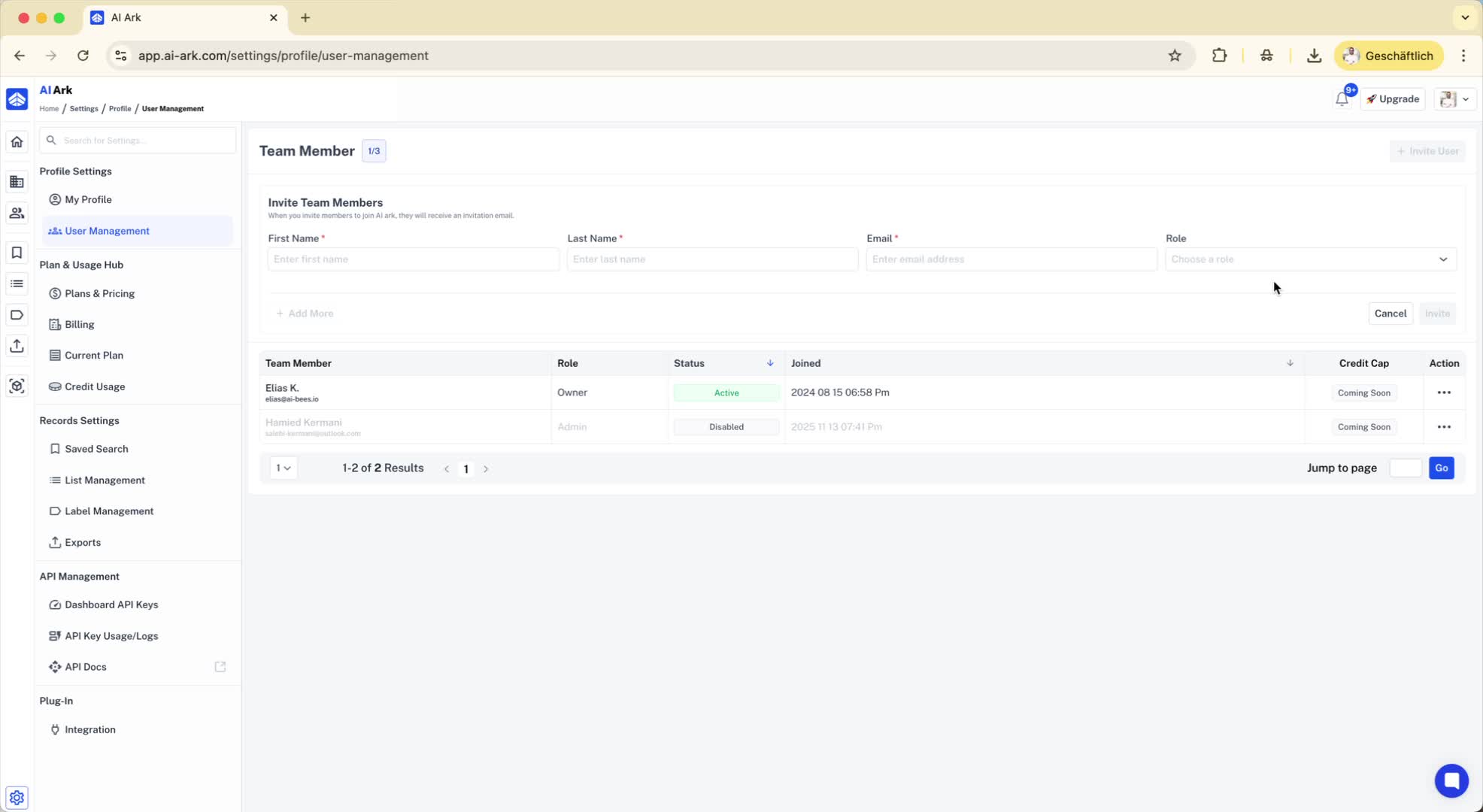 In the User Management section, click on 'Invite User'.