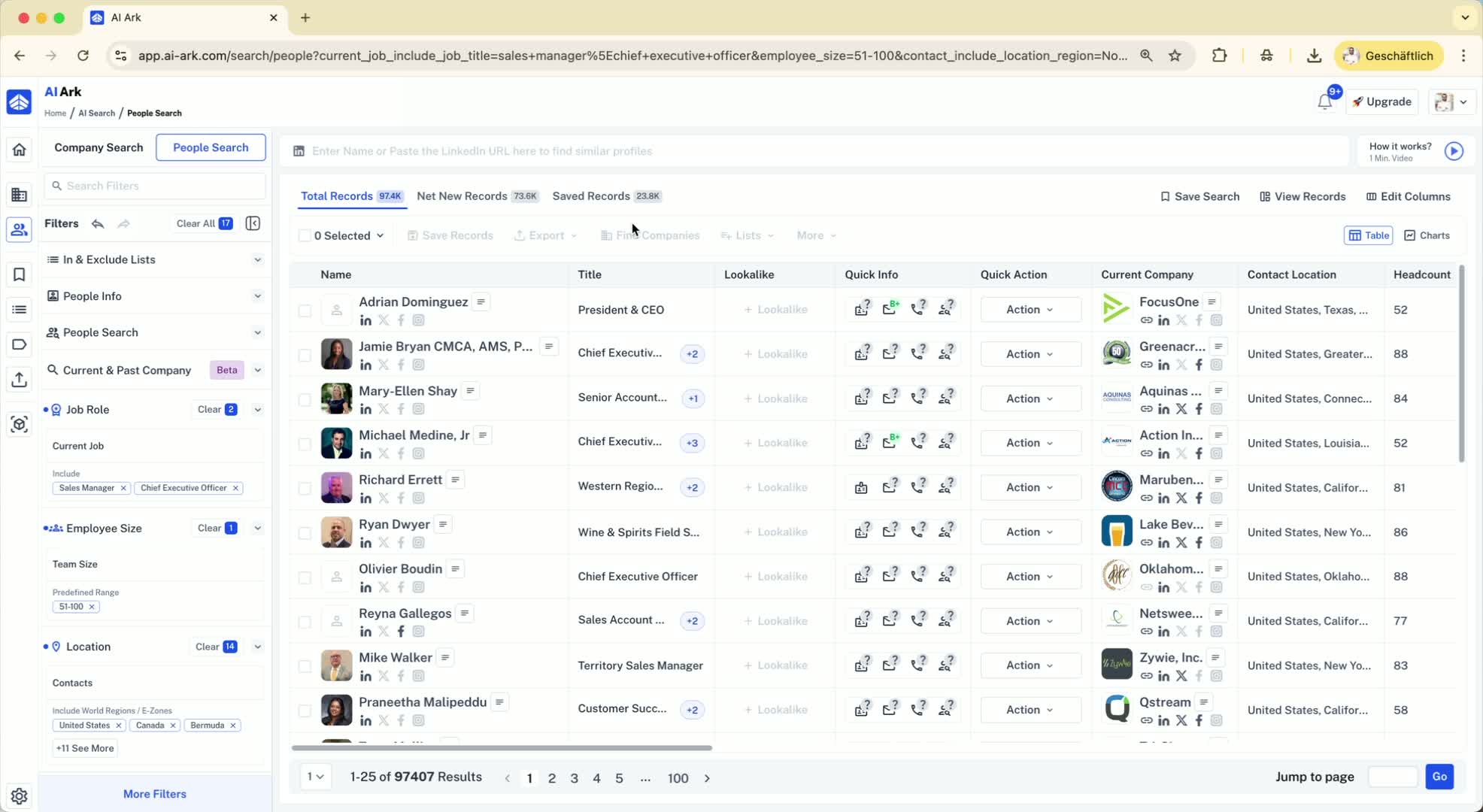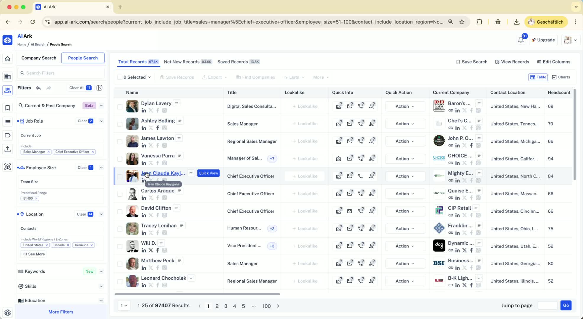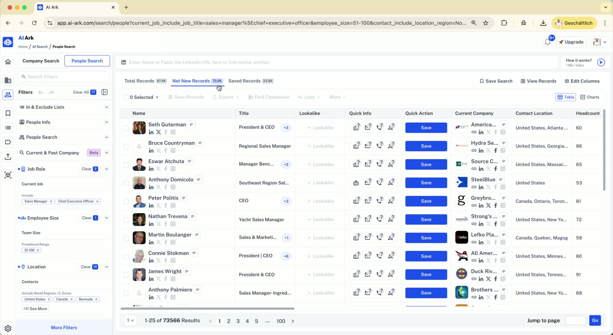 Example: Search for 'Sales Manager' and 'CEO' with employee size 50 to 100 in North America.
