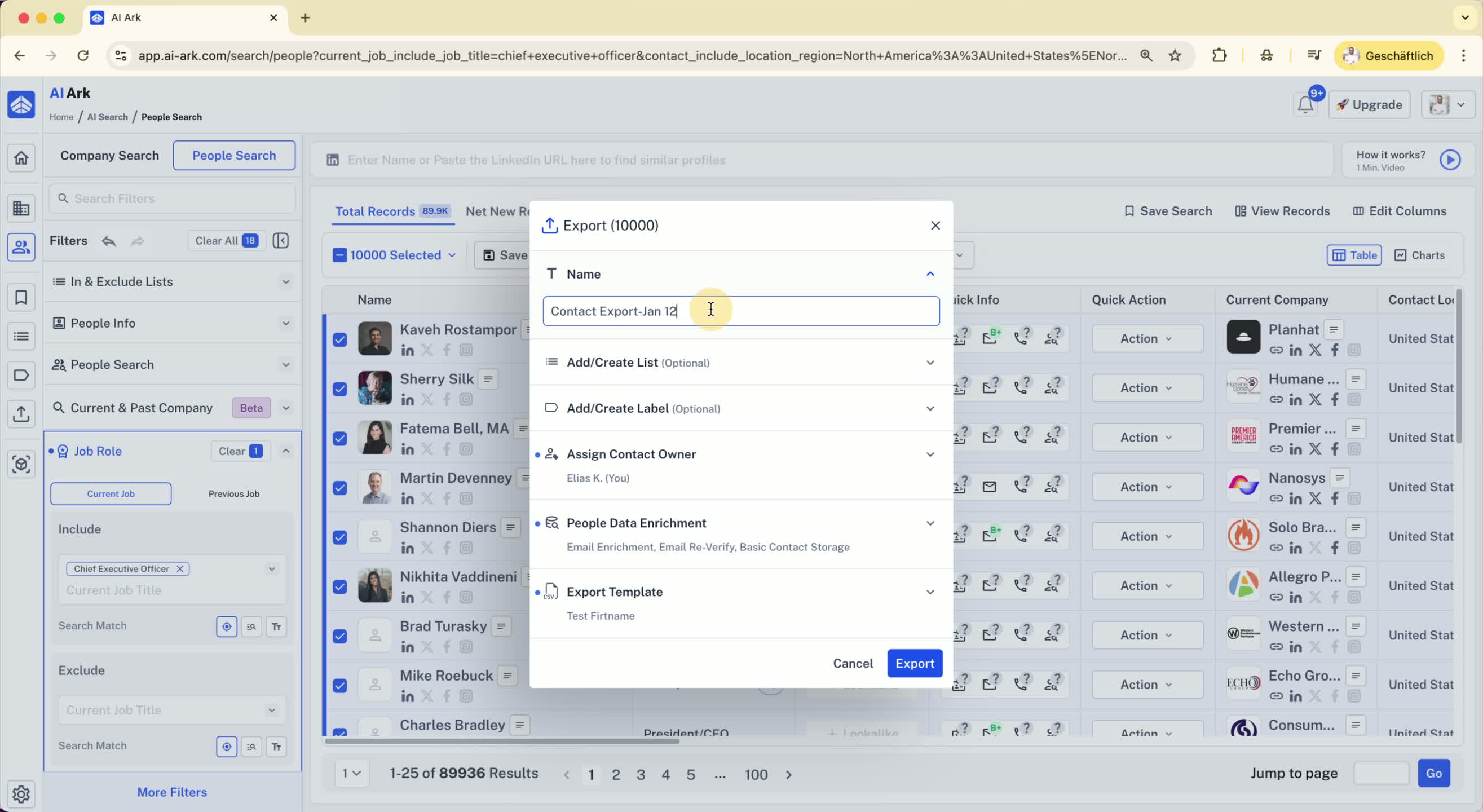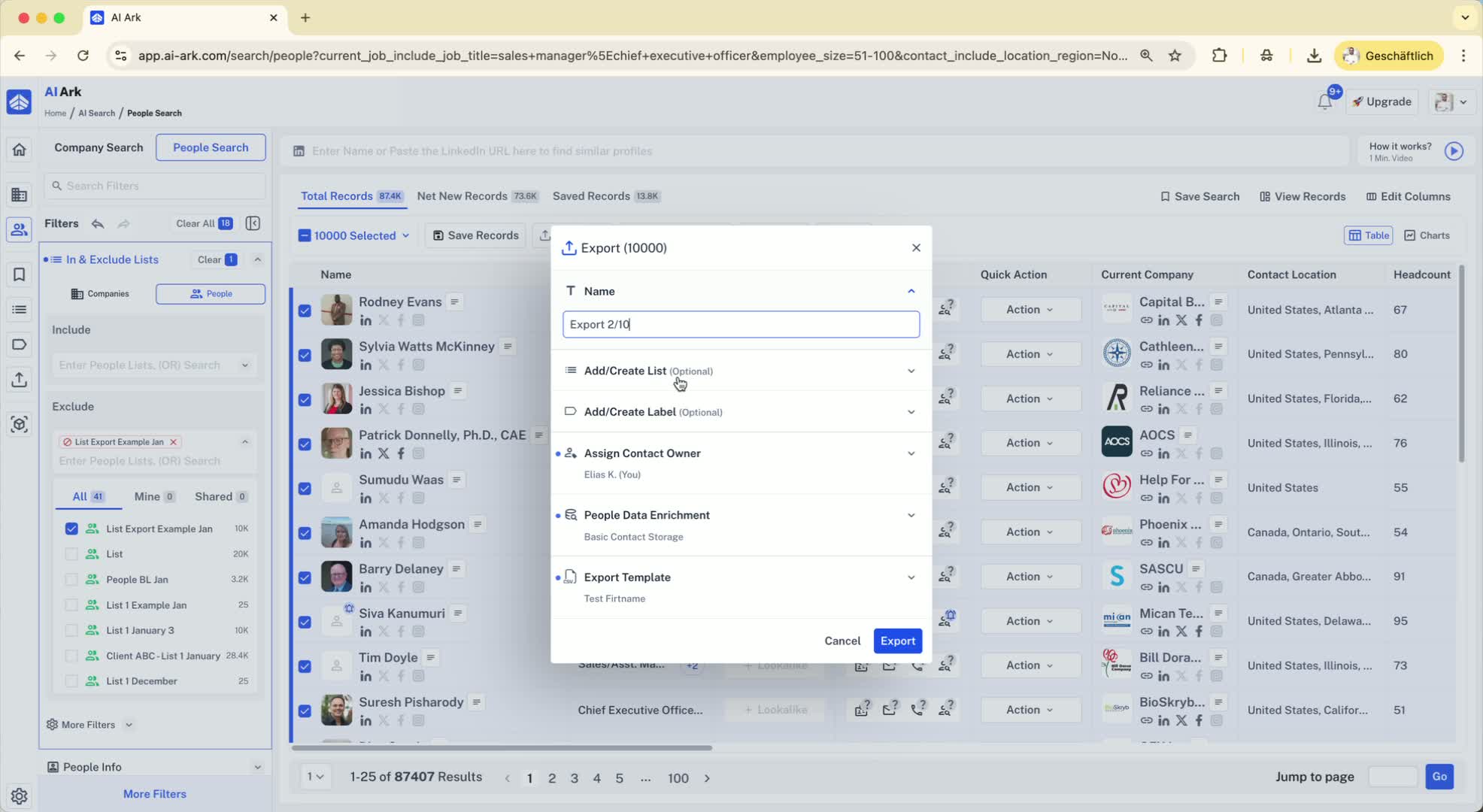 Begin by defining your search criteria (e.g., job titles, employee size, location).