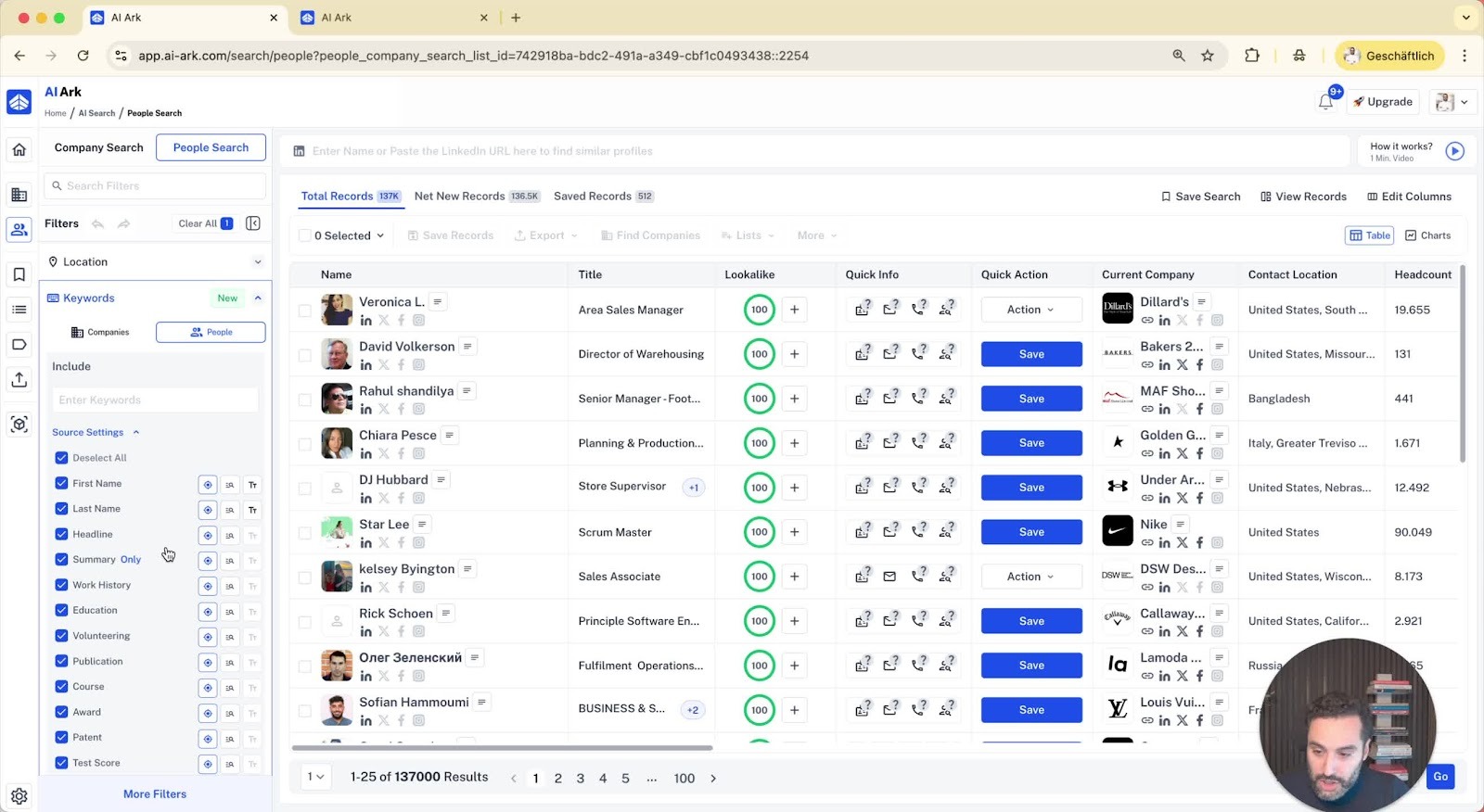 Filter people based on job roles, locations, and specific mentions in LinkedIn profiles.